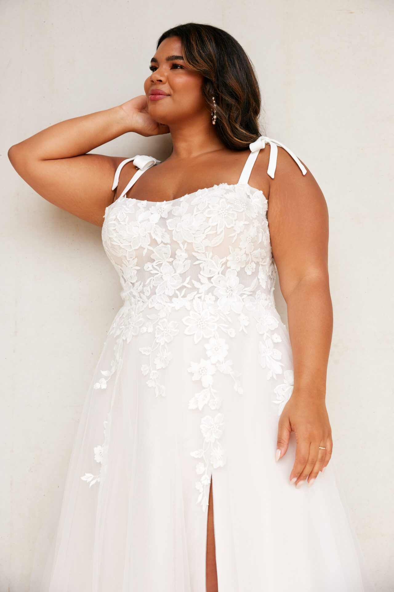 Description: Romantic Plus Size A-Line Wedding Dress with Pockets. Transform the aisle into the runway in this fashion-forward plus size A-line wedding dress with pockets. Style 7899 features sleek shoulder straps with a flirty handcrafted bow detail atop each shoulder, joining the elegant scoop neckline. Gorgeous floral lace envelops the sheer bodice and cascades into subtle lace appliqués to adorn the chic soft A-line skirt with hand pockets and a thigh-high leg slit. On-trend, this luxurious A-line wedding dress delivers romance with a modern designer edge.