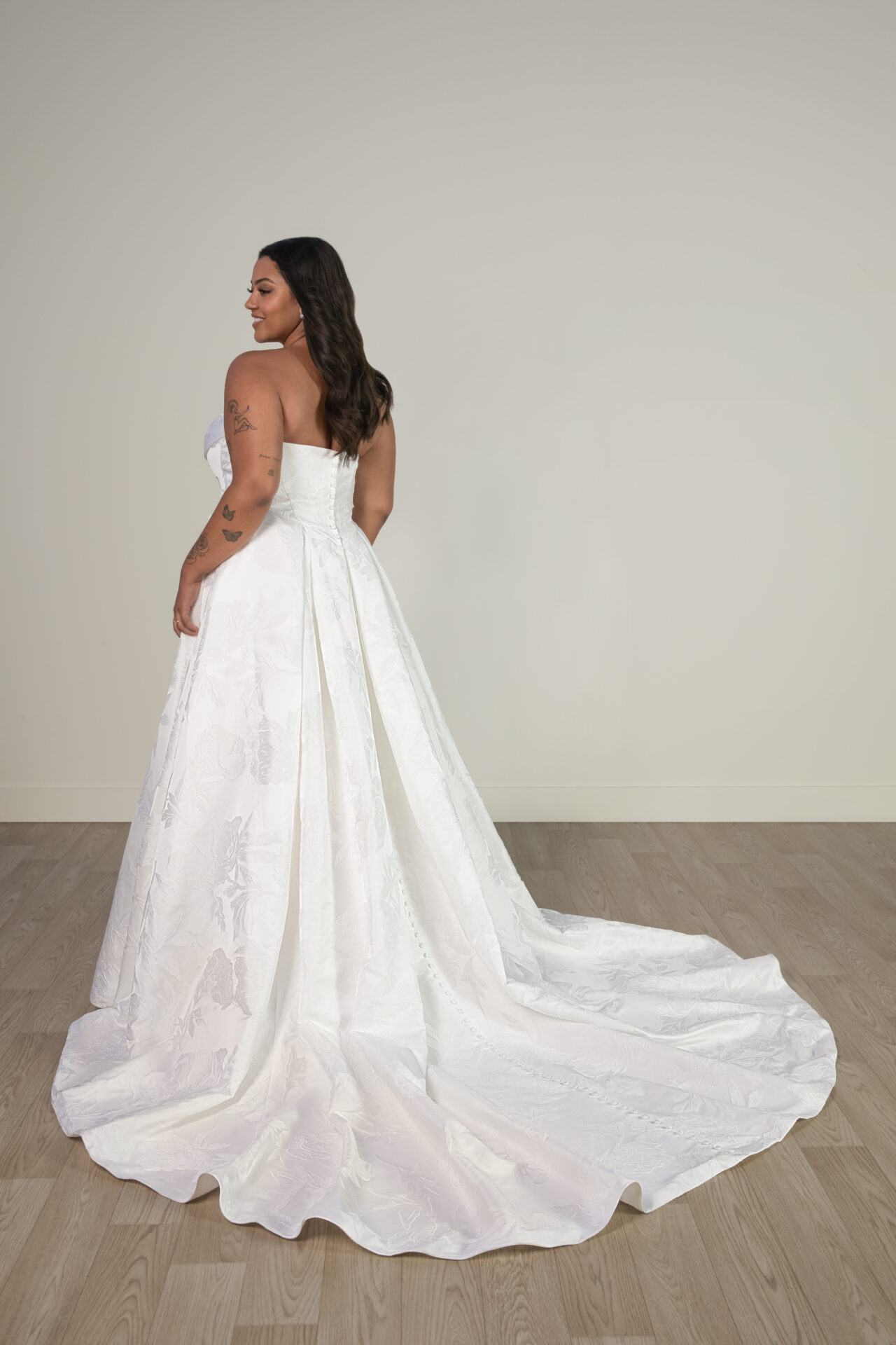 Description: Modern Strapless Princess Ballgown Wedding Dress with Basque Waist. For the bride who combines modern sophistication with timeless romance, Style SY8084 brings together whimsical fairytale charm and contemporary elegance. This breathtaking strapless ballgown features a ruched neckline that gracefully wraps into a Basque waist bodice. Contoured seams shape the figure before glowing into a pleated skirt, finished with a row of fabric-covered buttons that add a classic, refined touch. The pleated waist accentuates the princess silhouette, expanding into a voluminous ballgown skirt crafted from luxurious satin, achieving a sleek fashion-forward look.