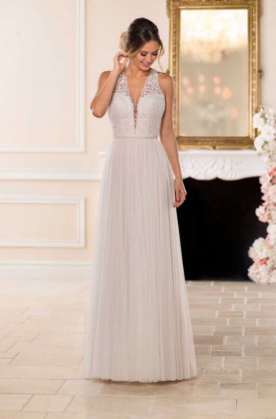 With a completely open back and a total boho vibe, this designer wedding dress by Stella York is a knockout! Lace and French tulle over matte side lavish satin come together to create a beautiful boho wedding dress. The cotton-style lace lends itself to the easy-to-wear vibes of this dress with a deep V-neckline and halter-inspired straps. A kissing scallop detail has been added to the neckline as a sweet and delicate detail. The floaty tulle skirt has a short train that makes dancing the night away a breeze! Brides will love the modern and unique pairing of the graphic lace top with the simple skirt. The open back forms a modern keyhole feature for one final touch of boho inspiration.