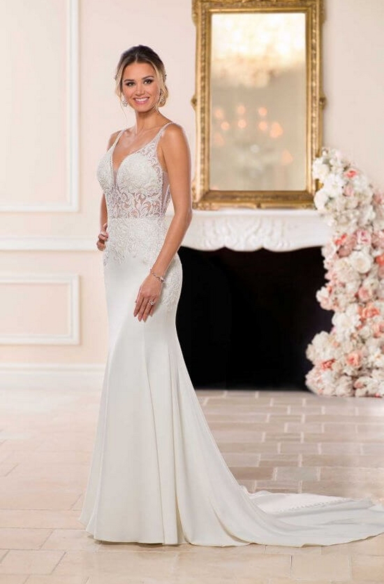 This sexy wedding dress by Stella York is totally swoon-worthy from every angle! Beaded banded straps create a V-neckline and V-back with a totally sheer bodice, covered with a lace overlay. The lace and crepe of this dress create a relaxed fit-and-flare silhouette that hugs the bride’s body in all the right places. Ivory illusion tulle on the bodice is adorned with scrolling lace, which drapes down the sides seams, creating a sexy shape. The all crepe train is long and dramatic with fabric covered buttons down the length of the back and train. This updated silhouette gives off a vintage, yet dramatic vibe.