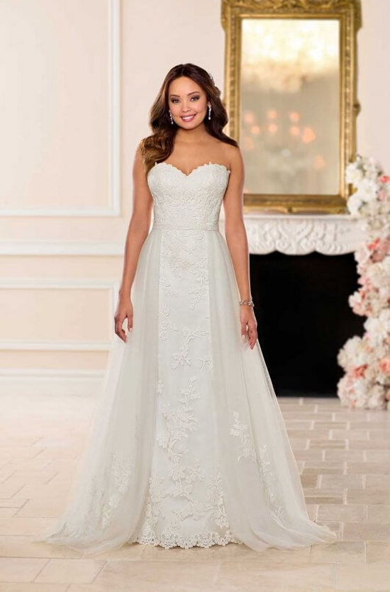 Floral, matte lace and tulle create a truly one-of-a-kind wedding dress in this stylish silhouette from wedding dress designer Stella York. A detachable tulle overskirt is embellished with matching matte floral lace for a look that can easily be changed from ceremony to reception. Leaf-inspired lace is gathered around the sweetheart neckline for an organic finish that is inspired by a morning in the garden. A simple style with a puddle train, this wedding dress is slightly modern in its fit-and-flare silhouette.