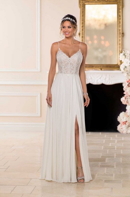 This dress was made for a beach wedding! Simple yet sexy this wedding dress by designer Stella York is perfect for the bride wanting an ocean view at her wedding. Lace and relaxed crepe chiffon form a sleek and simple sheath silhouette that is both easy-to-wear and daring. A sexy slit in the skirt provides movement and comfort, while stacked sequin on the sheer bodice add drama. The organza bodice has an illusion effect without feeling too sheer. Shoestring straps connect a V-neckline with a plunging, open back that leads to a longer crepe chiffon train.