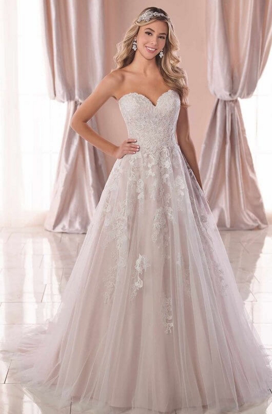 Classic with a twist! This A-line wedding dress with sparkle tulle by designer Stella York is a total knockout! Made of traditional lace and tulle, this updated A-line silhouette is a dream come true for brides who want that classic bridal style but with more sparkle. A layer of exclusive Stella glitter tulle gives this dress a unique WOW factor that all brides will love! Luminous floral lace is gracefully sewn onto the bodice and floats down the length of the tulle skirt for movement and drama.