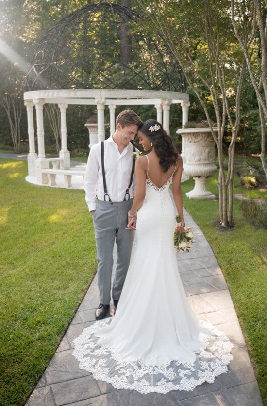 Superbly sexy and just waiting to for you to wear it on the beach, this sheath-style wedding dress from bridal designer Stella York is such a statement maker. Lace on sleek crepe creates a silhouette that clings to the body in all the right places. Beaded shoestring straps have a small illusion detail at the peak of the V-neckline and dip down the open back. Scalloped trimmed lace lines the edge of the train, which mirrors the latticework on the bodice. A hint of sparkle has also been added to the lace on the bodice for one final touch of sexy detail. This beach wedding dress zips under fabric-covered buttons.