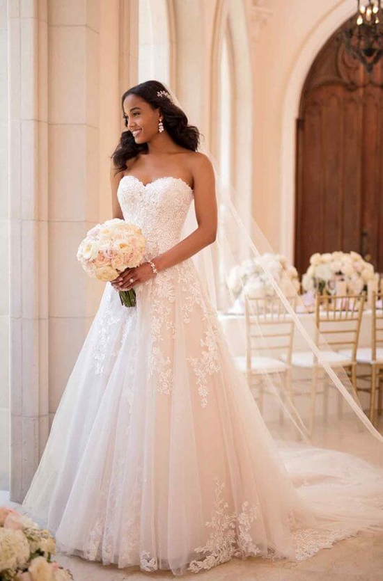 Garden-inspired and so very graceful, this A-line wedding dress by Stella York is simply stunning. Multiple layers of lace come together on the bodice creating a softer feeling, while the water pearl detailing adds a hint of shimmer and textural feel. The botanical lace is heavy on the bodice but creates a vine-like pattern down the length of the tulle skirt, mimicking the wild romance of a garden setting. A cathedral length train has hand-placed laces around the hemline, giving it a very light feeling.