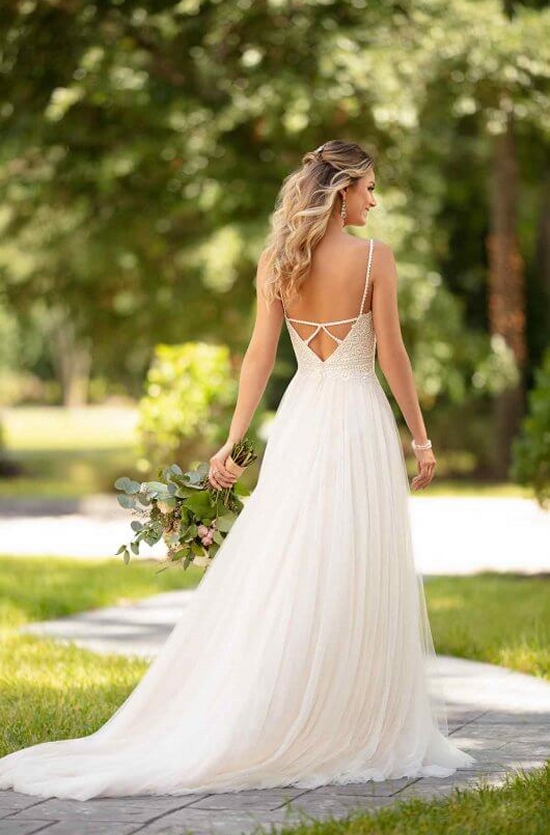 Exquisitely boho and perfectly casual, this wedding dress by bridal designer Stella York is a dreamy combination of comfort and style. Lace and delicate French tulle create a relaxed A-line silhouette made for magical moments. This dress is definitely for the fashion-forward boho bride with its really cool triangle back detail. Swiss dots are used on the bodice throughout the lace, making the pattern of the boho lace interesting and unique. A hint of twinkle has also been added to the lace to juxtapose the softness of the French tulle skirt. The triangle back is the real showpiece of this dress. Made of beaded shoestring straps, the geometric back demands to be seen.
