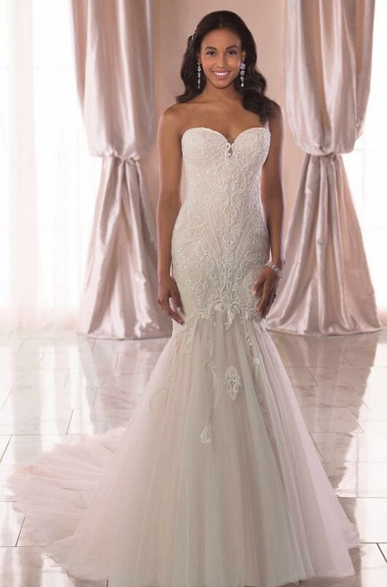 Linear lace takes center stage in this trumpet wedding dress. A fitted bodice made of beautiful lace fits through the hips and flares dramatically just above the knees, creating a silhouette that is simply to-die-for! Radiant, all-over sparkle on the bodice extends through the hips creating a dazzling effect. The lace motifs on the bodice cascade from the shaped seams onto the tulle skirt for a stunning detail, while the lace pattern of this trumpet dress feels updated and graphic. Multiple layers of tulle add frothiness, drama and much-appreciated movement to the skirt as it extends into a long train.