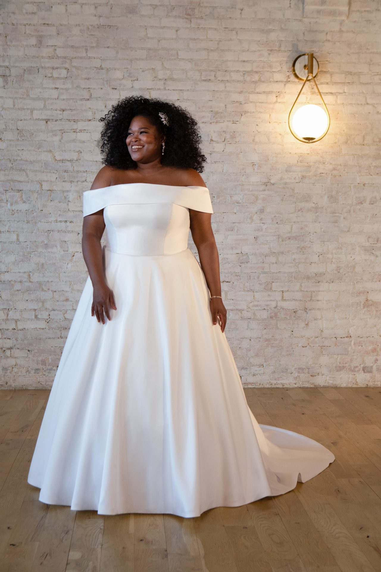 Description: Timeless A-Line Wedding Dress with Off-the-Shoulder Neckline. Old Hollywood glamour meets modern bridal sophistication in Style 7535. Designed in an elegant Mikado, this timeless A-line wedding dress features a regal, off-the-shoulder banded neckline for a flattering and princess-like appeal. From the waist, the dress extends into a full skirt and train with discreet pockets and a horsehair hem for a formal and structured look. The Mikado-covered buttons add an elegant back detail that extends all the way from the high neckline to the end of the train for a simple yet stunning finishing touch.