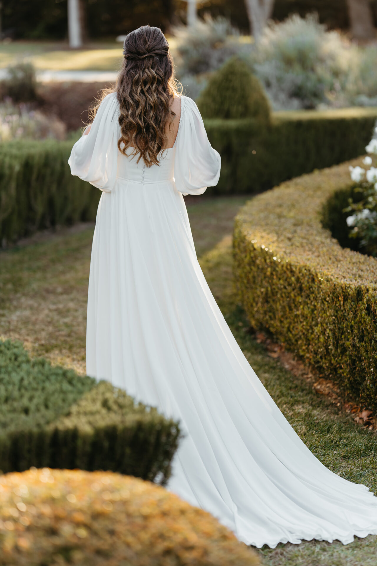 Description: Modern Off-the-Shoulder Chiffon A-Line Wedding Dress with Sleeves. Understated drama meets modern elegance in Style 7901—an effortlessly luxurious chiffon wedding dress with detachable long sleeves. The detachable sleeves, which can be worn on or off-the-shoulder, meet a chic scoop neckline bodice with a demure row of fabric-covered buttons in the back. The soft A-line silhouette gently floats atop the figure for a liquid silhouette that glides gracefully with every movement with a thigh-high leg slit for added appeal. For the bride who believes in stunning simplicity, this blouson dress with detachable sleeves delivers romance through impeccable refinement.