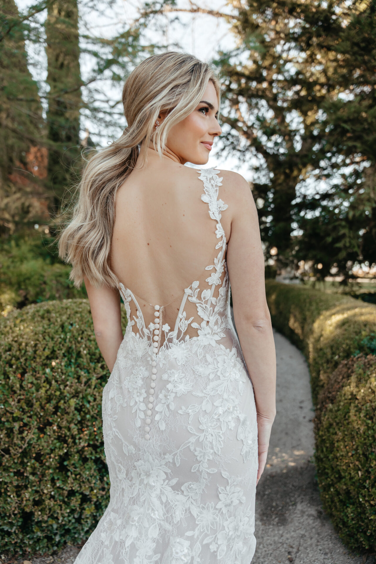 Description: Scoop Neck Tulle Wedding Dress with Spaghetti Straps. The mesmerizing Style 7941 shimmers down the aisle with an extravagant display of embellished glitter tulle and floral lace. The sparkly fit-and-flare wedding dress features romantic lace spaghetti straps that dip into a flattering scoop neckline. The fitted bodice is available with split options to pair with the sultry lace side cutouts and the lacy low illusion back detail. From the waist, handcrafted lace appliqués scatter across the glittering fit-and-flare skirt, with an optional leg slit for added charm. Culminating in a beautifully shaped train, this exquisite scoop neck fit-and-flare wedding gown makes a glamorous statement on that special day. This gown is available with or without a glitter tulle skirt.