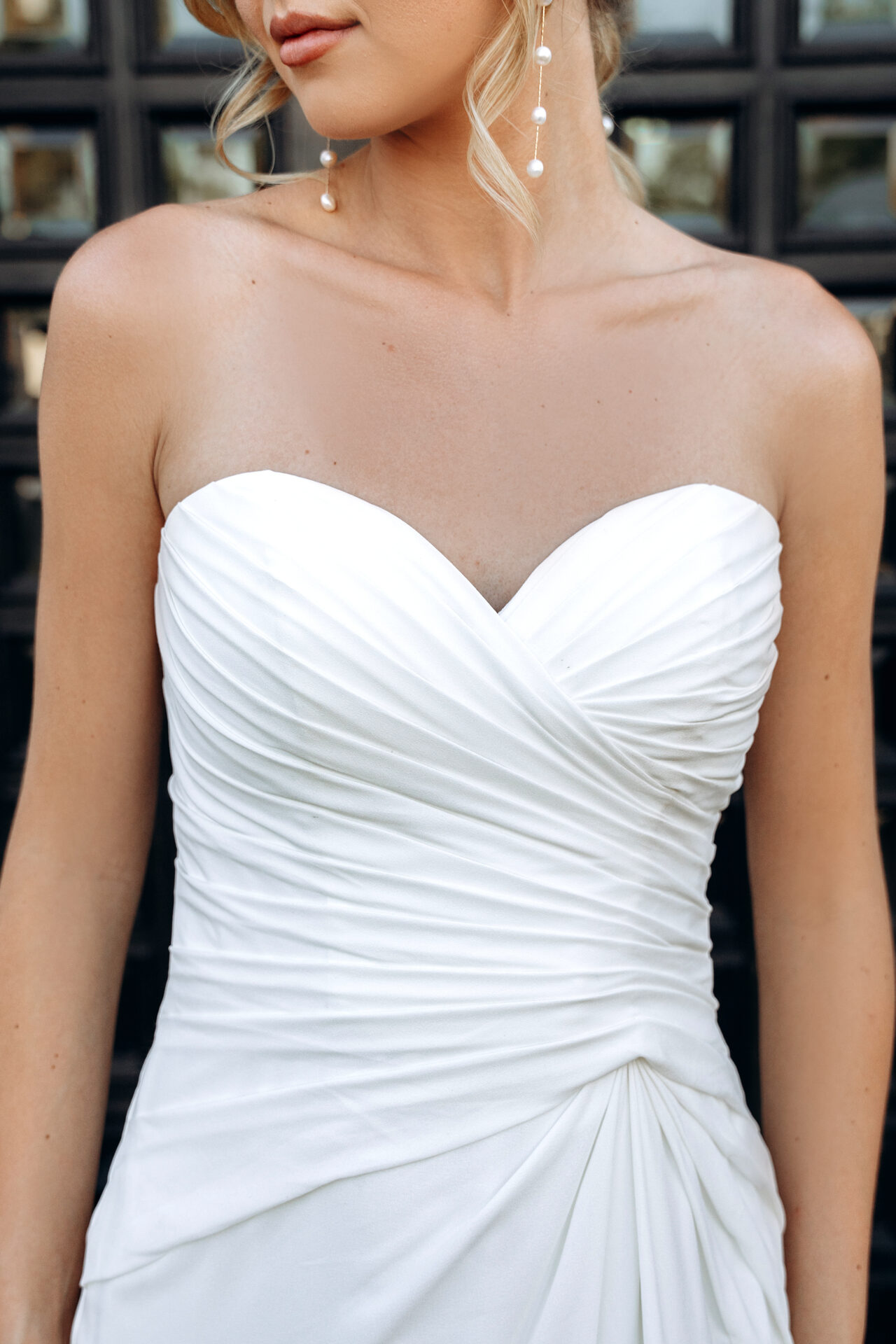Description: Glamorous Strapless Chiffon A-Line Wedding Dress with Sweetheart Neckline. A chic strapless wedding gown that epitomizes effortless elegance, Style 8004 features a soft A-line silhouette wrapped in the beauty of chiffon fabric. The strapless bodice features a stunning draped design with gathered details that flatter the figure and create a stunning visual effect. A sweetheart neckline adds a touch of romance while the clean and chic bridal look keeps the overall aesthetic modern and sleek. Echoing the wrapped detail of the bodice, a gathered back detail forms just above the hip before cascading into the sweeping A-line skirt that moves gracefully with every step. Also available in plus sizes, this chiffon wedding dress offers a universally flattering option for brides seeking a combination of glamour and modern elegance.