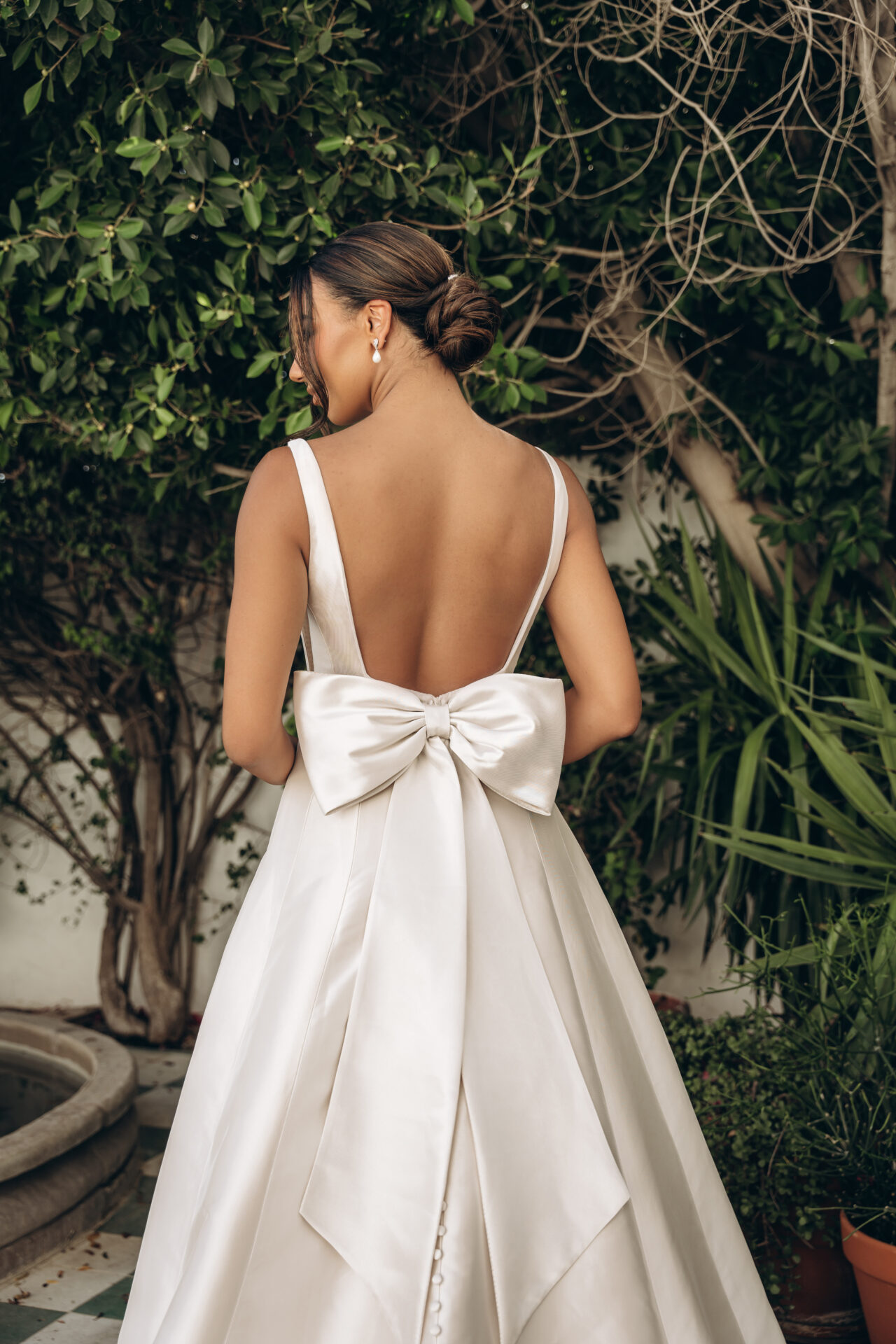 Description: Simple Minimalist A-Line Wedding Dress with Square Neckline and Detachable Bow. Style 8031 redefines bridal elegance with a modern, minimalist approach to creating a luxe A-line wedding dress that stands the test of time. This simple wedding dress features a refined square neckline framed by modest shoulder straps, setting the tone for its contemporary chic aesthetic. The gown’s clean lines are accentuated by the vertical seams running the length of the dress, perfectly highlighting the figure and graceful A-line silhouette. A touch of elegance is added with modest side cutouts that dip to a drop waist in the back, where an oversized detachable Mikado bow makes a striking fashion statement. Crafted entirely in luxe Mikado fabric, this dress shimmers and glistens in the light, creating a unique bridal look that’s both timeless and distinct.