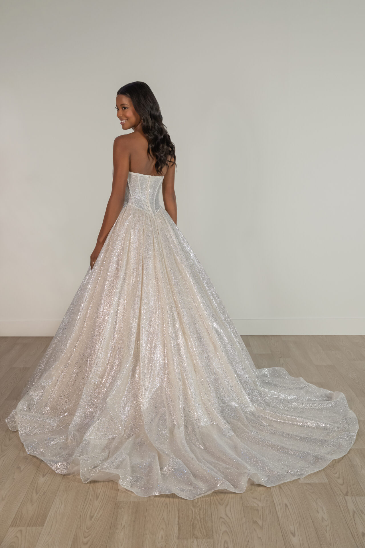 Description: Sparkling Strapless Ballgown with Basque Waist. A true showstopper designed for the modern princess, Style SY8133 is designed for the fashion-forward bride. This enchanting ballgown features a strapless cat-eye neckline that flows into a striking corset-style bodice with exposed boning, adding a touch of regal allure. From the Basque waist, layers of shimmering tulle cascade gracefully, creating a glittering, dramatic effect with every step. Blending timeless elegance with contemporary glamour, this princess-worthy wedding dress is made for both the aisle and the dance floor.