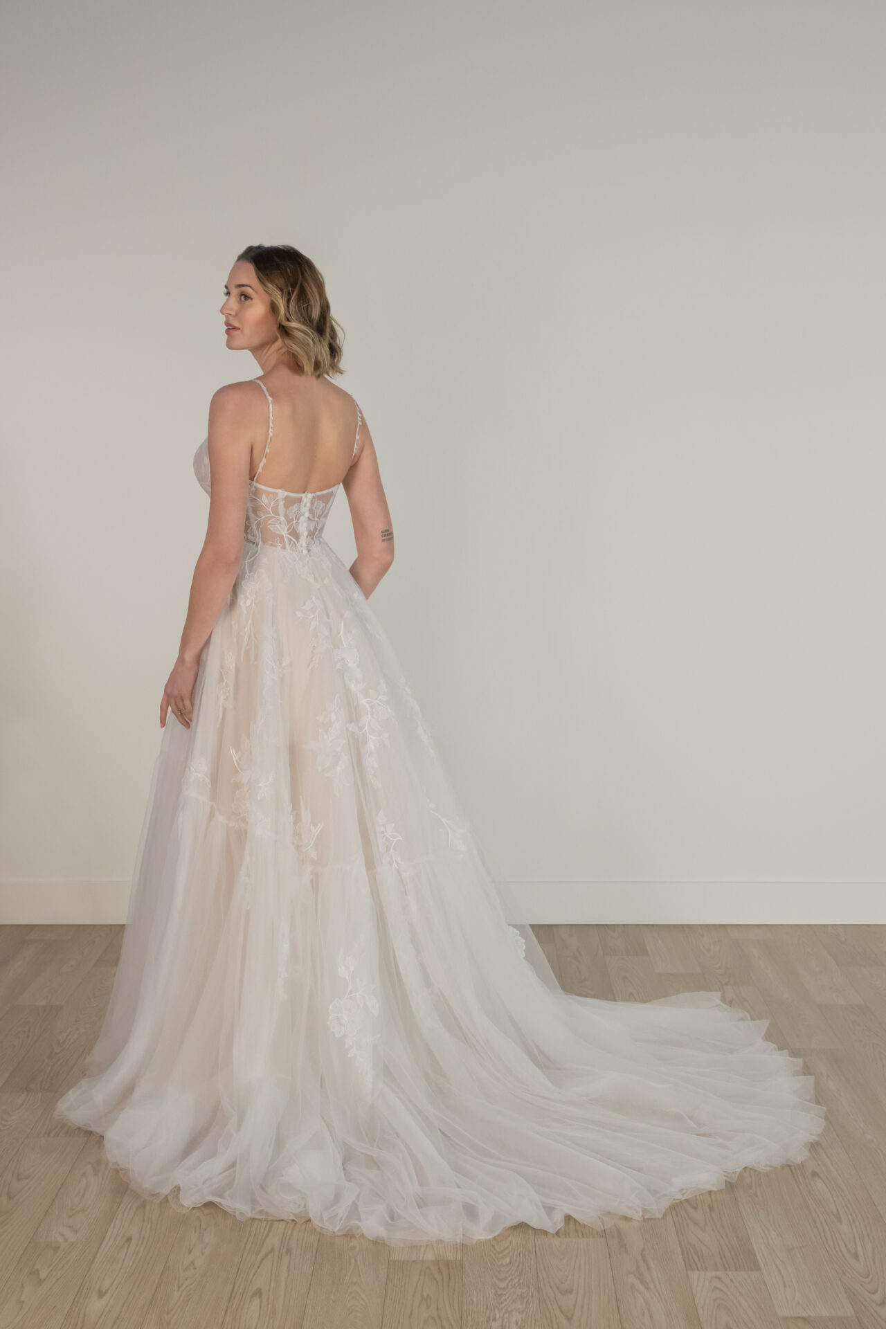 Description: 3D Lace Ballgown Wedding Dress with Tulle Skirt and Spaghetti Straps. A harmony of glamour and romance, Style SY8153 is a breathtaking lace ballgown designed for the princess at heart. Delicate 3D lace-adorned spaghetti straps lead to a sheer bodice, where a soft V-neckline and exposed boning add a touch of sultry sophistication. Intricately crafted with 3D organza petals and matte lace, the bodice showcases exquisite detail before flowing into a dreamy, voluminous skirt. From the waist, scattered floral appliqués cascade across tiered layers of soft tulle, creating a truly enchanting silhouette. A stunning blend of timeless elegance and modern allure, this ballgown is a showstopping choice for the romantic bride.