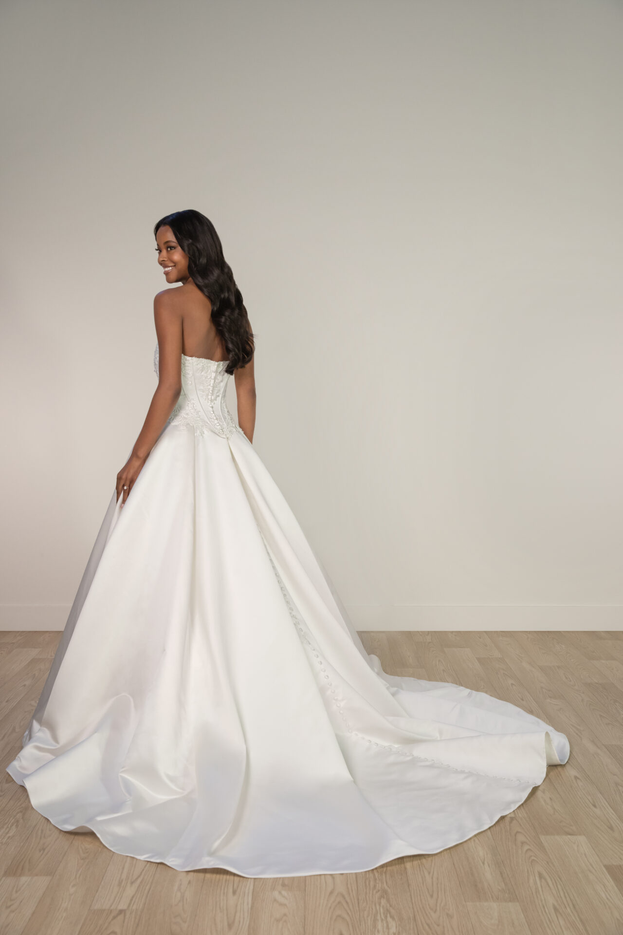 Description: Style SY8246 exudes timeless elegance with a modern twist. Crafted from smooth satin, this strapless wedding dress features a structured bodice adorned with intricate beaded lace that adds delicate sparkle and texture to the clean lines. The drop waist bodice with a deep plunge neckline is finished with a Basque waistline before flowing into a classic, full ballgown skirt that floats gracefully with each step. The back is finished with a row of fabric-covered buttons from bodice to hem, adding a refined touch to this sophisticated bridal gown.