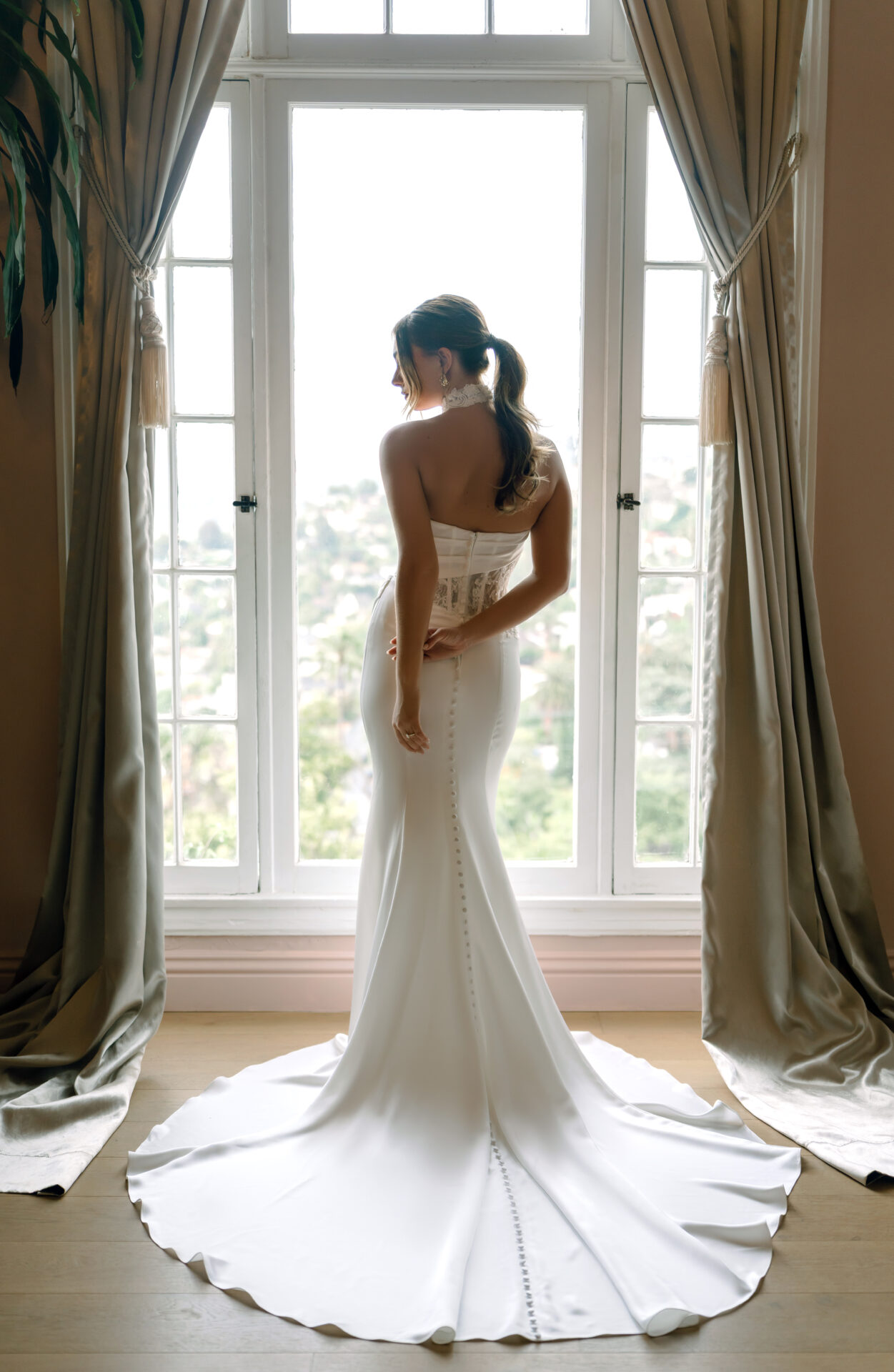 Description: Style SY8248 redefines modern bridal elegance with a daring twist. This strapless Belle Satin column gown features a draped satin bodice that gracefully breaks away to reveal an asymmetrical peekaboo corset at the centre, adorned with scrolling lace appliques for a touch of intricate romance. The structured corset, complete with boning, sculpts the figure into a flattering hourglass silhouette. Clean lines flow into a sleek column skirt that glides effortlessly with each step. A row of fabric-covered buttons trails down the back, adding classic sophistication. This gown is for the bride seeking a balance of romance and edge.