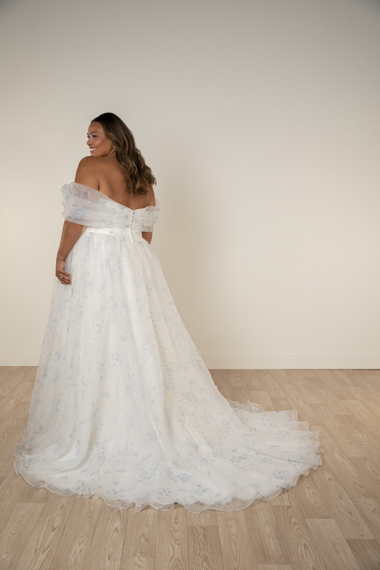 Description: Style SY8215 in French Blue reimagines bridal romance with a fresh and vibrant twist. Crafted in soft organza adorned with subtle blue floral prints, this A-line wedding dress features and elegant Basque waistline that beautifully accentuates the figure. Off-the-shoulder straps lead to a romantic sweetheart neckline, framing the bodice with timeless charm. Layers of lightweight chiffon gently wrap and flow from the waist, while a high leg slit adds a modern touch and effortless movement. For the bride seeking a unique blend of classic elegance and contemporary flair. This gown is also available in plus sizes.