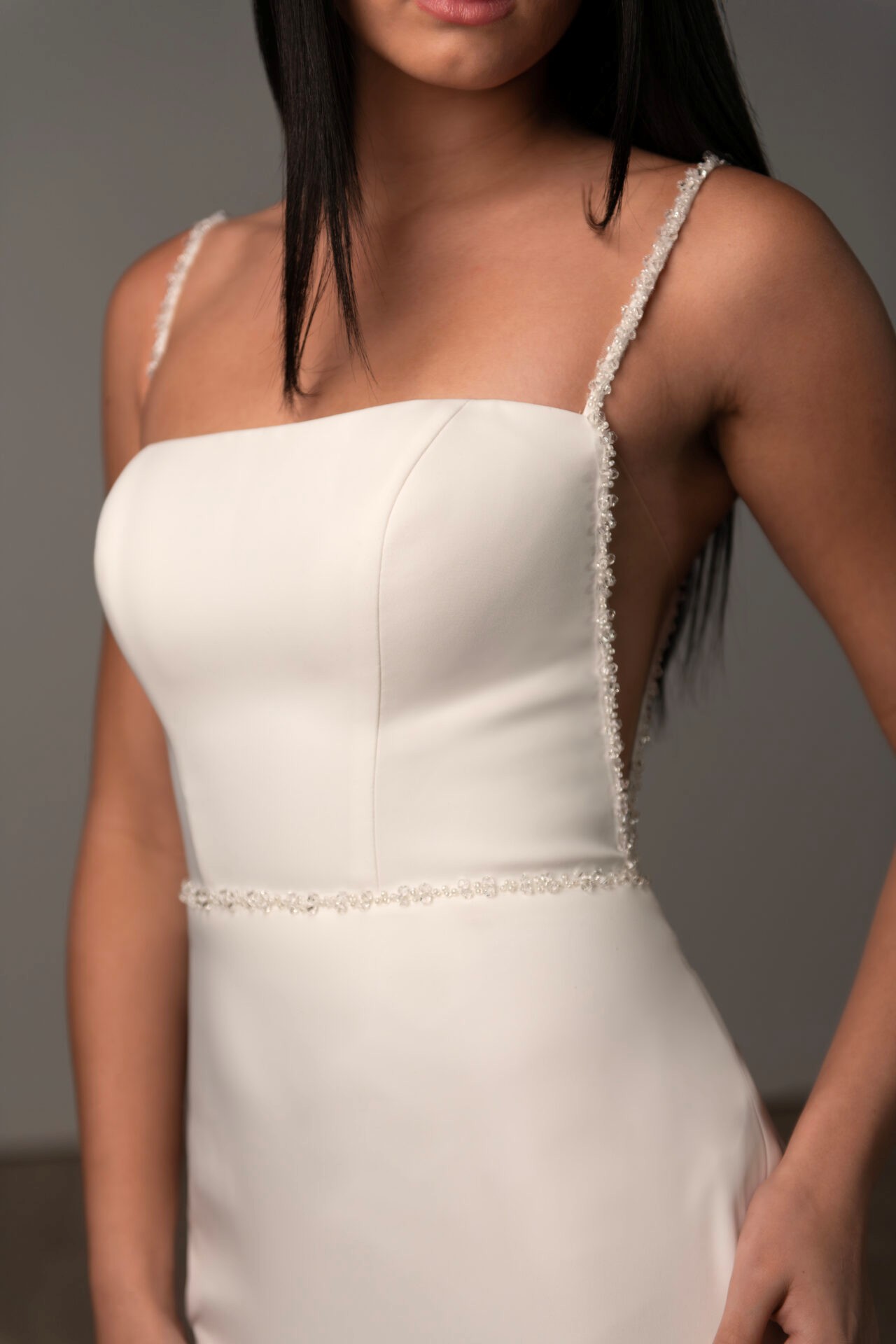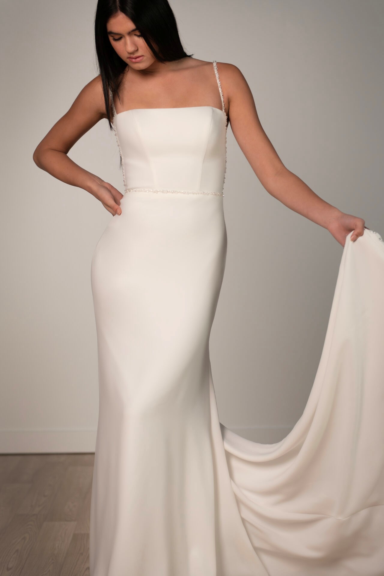Description: Effortlessly glamorous in its refined simplicity, this elegant square-neck wedding dress defines modern bridal style with its sleek column silhouette. Style SY8071 is expertly crafted from shell crepe fabric, creating a smooth, structured look that is both timeless and fashion-forward. Delicate crystal-beaded straps frame the contemporary square neckline, leading to striking side cutouts that add a touch of allure. A subtle scoop back is accented by a shimmering line of crystal beading, flowing into a row of crystal buttons that trail down the entire length of the gown. Ideal for the bride seeking a sophisticated yet contemporary aesthetic, this crepe column wedding dress makes an unforgettable statement.