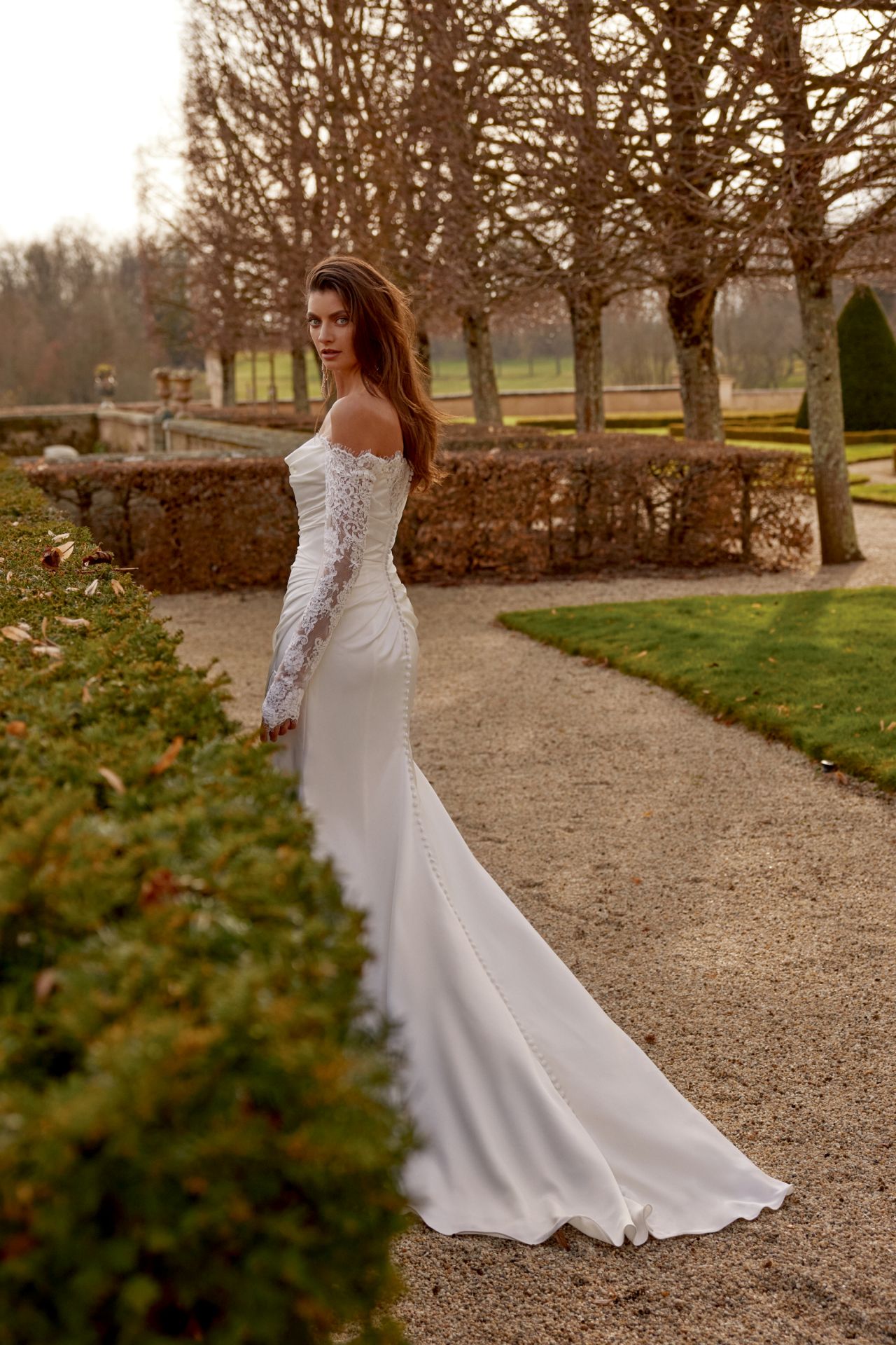Description: Long Sleeve Fit and Flare Gown with Off The Shoulder Neckline. Jessa is a vision of effortless romance and modern elegance, designed for brides who want to feel timeless and beautifully feminine on their wedding day. This stunning gown features an off the shoulder neckline framed with delicate scalloped lace that flows into stunning long sleeves. The softly draped bodice enhances the figure, while the gentle ruching along the hips creates a flattering silhouette. An optional side leg split adds a graceful sense of movement, complemented by a row of fabric covered buttons down the centre of the chapel train, adding a classic bridal finish.