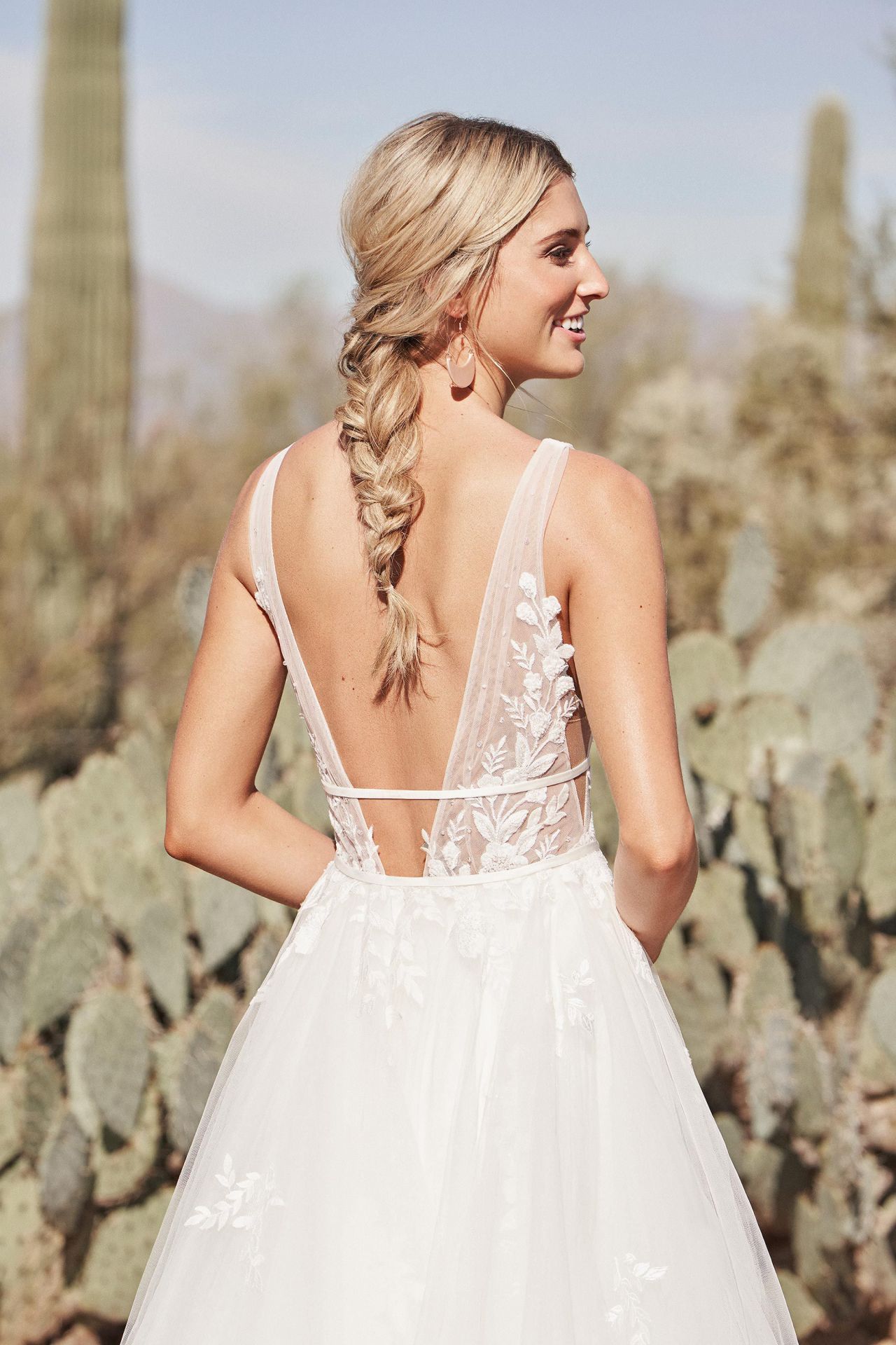Description: Feel dreamy in this feminine tulle wedding gown. Light beading blends with soft lace to embellish the plunging neckline and low back. Side cutouts and double bands at the waist compliment the sexy bodice. Layers of soft English net complete this romantic look. This style is also available with the front bodice lined to the side illusion inserts.