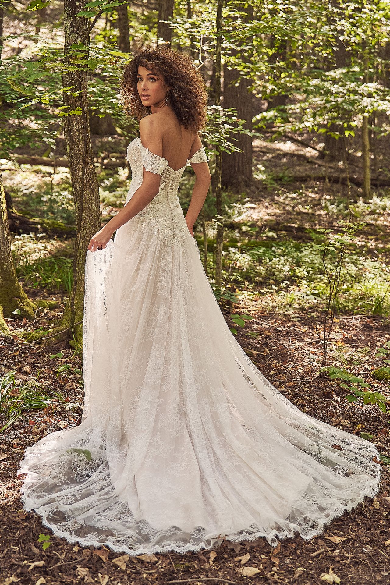 Description: This modern asymmetrical gown layers Chantilly lace across the bodice in delicates pleats ending on the cross at the hip, falling into a soft A-Line skirt which flows around your hips and legs to beautifully accentuate your waistline. The soft off shoulder straps open up the décolletage. 66350 is a dream to wear giving you a boho feel with all the construction required to create an effortless hourglass figure.
